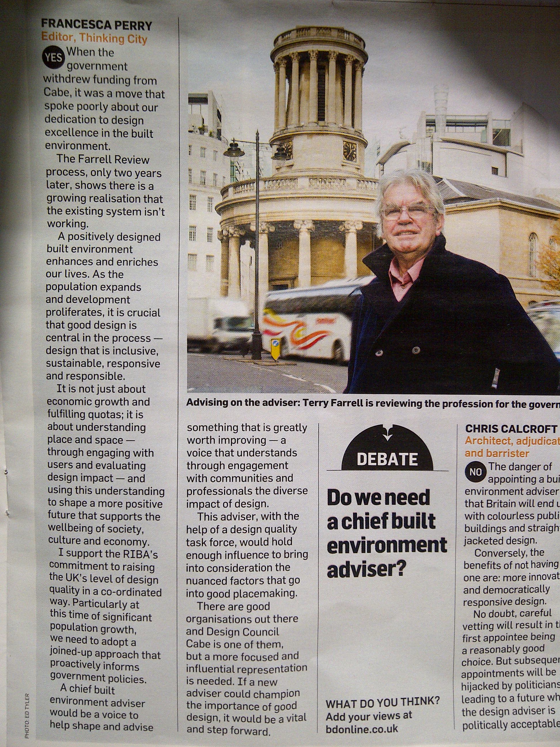 This month I wrote an opinion piece for the debate in Building Design over whether the UK would benefit from a Chief Built Environment Adviser to the government, as recommended by RIBA in their response to The Farrell Review. The full debate can be found here. What are your thoughts?