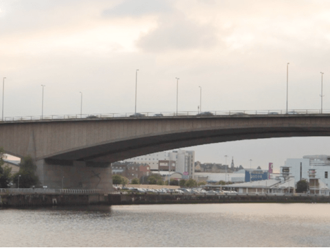 London to Glasgow – it takes a long time to return. We start to film Glasgow’s truncated walkways, the city’s concrete centre haunted by the ghosts of the Bruce Plan. We stop at the Kingston Bridge arching magnificently as it carries the M8 traffic north and south. Named after Glasgow’s first enclosed dock – 823 yards of quayside between Anderston and Tradeston – and a reminder of the city’s unacknowledged part in the transatlantic slave trade. The dock finally closed in 1966 when work on the bridge began. I tell E how an optimistic Clyde Port Authority had insisted that it had a clearance height to allow dredgers upstream.