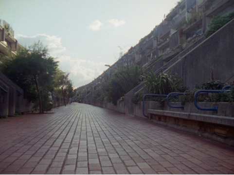 Fleet Road, down to Swiss Cottage, past Basil Spence’s library. C and I pass the Hilgrove flats with their beautiful chunky framed balconies and bend onto Alexandra Road and into the estate – the stadium-like curve you pass on the Virgin Pendolino Glasgow to Euston – the last large social housing complex to be built in London. Designed by Neave Brown and completed in 1978 these are ambitious and expensive flats that were funded by raising taxes from the surrounding, rich neighbourhood. We stop to film – the swim has thrown us off track and we’re tired. But the architecture lifts us, the concrete, the plants hazy and European.